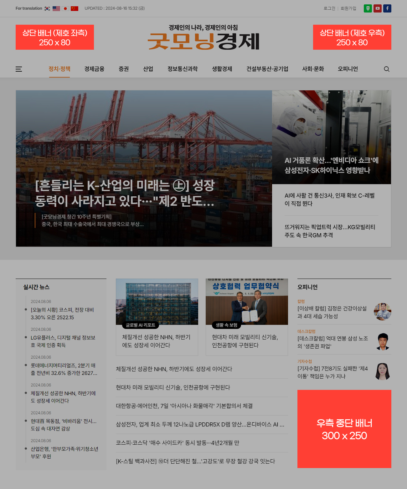 “굿모닝 코리아, 굿모닝 경제!” 온라인 배너 광고 단가표 광고위치 광고사이즈 (방식) 집행 비용 (단위 : 원) 상단 배너 (제호 좌, 우) 250 X 80 pixel (롤링) 10,000,000 / 1개월 우측 중단 배너 300 X 250 pixel (롤링) 10,000,000 / 1개월 "기사 화면내에서도 동일하게 표출됨"