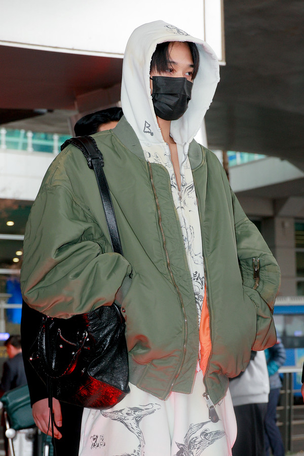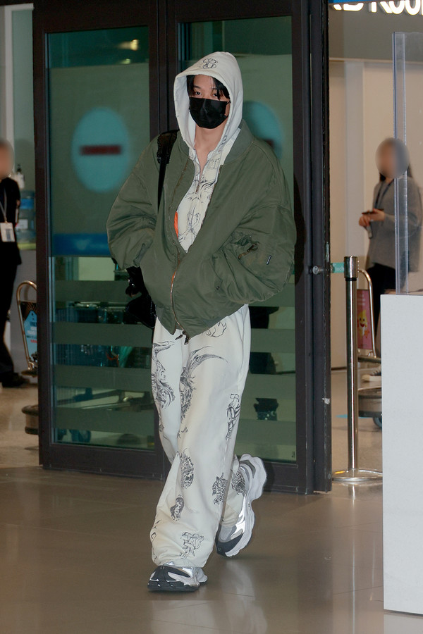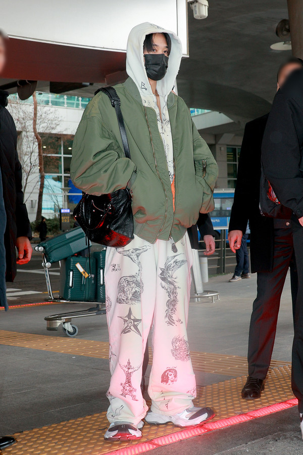 이날 더보이즈 주연은 타투 패턴이 프린팅된 후드와 스웨트 팬츠에 활용도 높은 숄더 봄버 재킷으로 편안하면서도 스타일리시한 공항패션을 선보였다.
