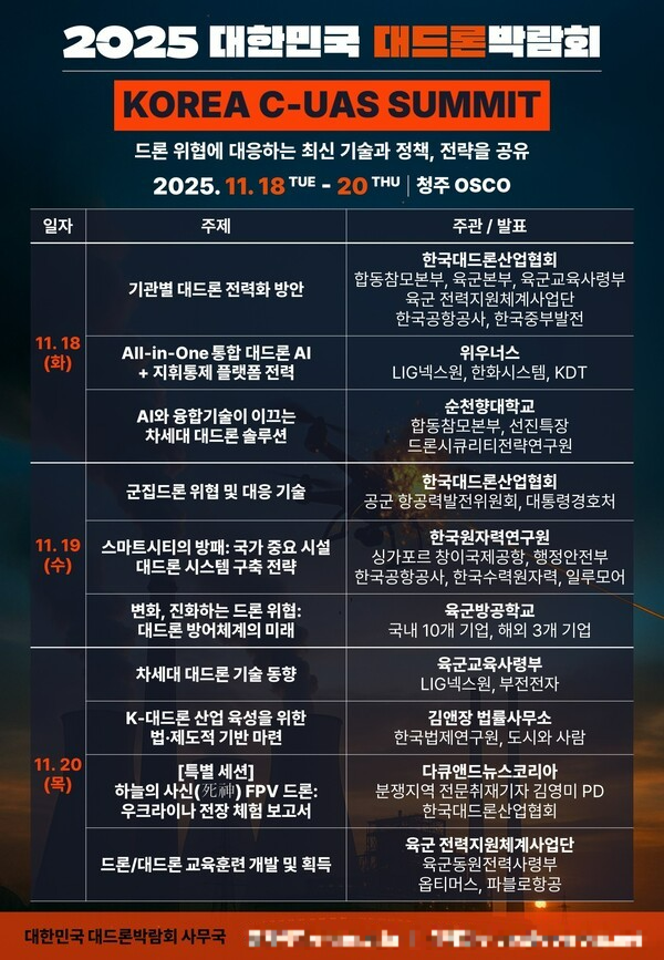 세계적인 이슈인 드론과 대드론 전쟁의 현장을 직접 확인하고, 최첨단 4차 산업혁명 기술을 체험하려면 이번 박람회 참가를 적극 권한다. 국가 안보와 산업 경쟁력이 직결된 대드론 기술의 현재와 미래를 한눈에 조망할 수 있는 절호의 기회다. 특히 우크라이나 전쟁에서 입증된 드론 기술의 파괴력과 이에 대응하는 최첨단 대드론 시스템을 직접 체험할 수 있는 기회는 흔치 않을 것이다.